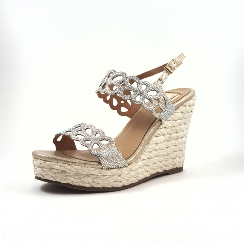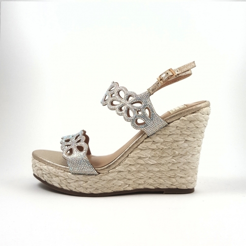 Sandalia modelo 0707 eFerri en color oro con dos tiras de detalles de brillo y sujeta por el talón con hebilla y plantilla de piel. La cuña forrada en esparto tiene una altura de 11cm. con una plataforma de 3cm.