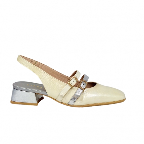 Zapato destalonado de punta cuadrada elaborado en piel, con tacón de 3 cm de altura. Con dos tiras finas paralelas con cierre de hebilla en el empeine, que permiten un ajuste perfecto al pie. Este zapato incorpora la tecnología Triflow, un triple almohadillado que genera de acolchado en la pisada.