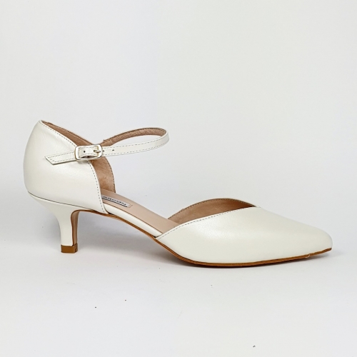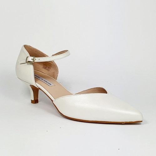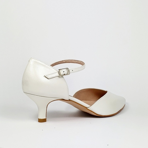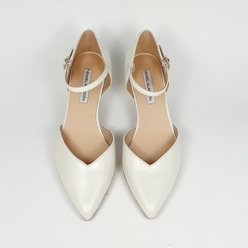 Zapato novia modelo 17505 Angel Alarcon en piel, cerrado de punta y talón con un tacón de 2.5cm. Ajustable pulsera al tobillo mediante hebilla. Plantilla interior acolchada para ir cómoda a tu evento mas especial. Hecho en España