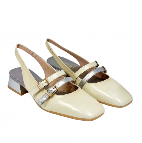 Zapato destalonado de punta cuadrada elaborado en piel, con tacón de 3 cm de altura. Con dos tiras finas paralelas con cierre de hebilla en el empeine, que permiten un ajuste perfecto al pie. Este zapato incorpora la tecnología Triflow, un triple almohadillado que genera de acolchado en la pisada.