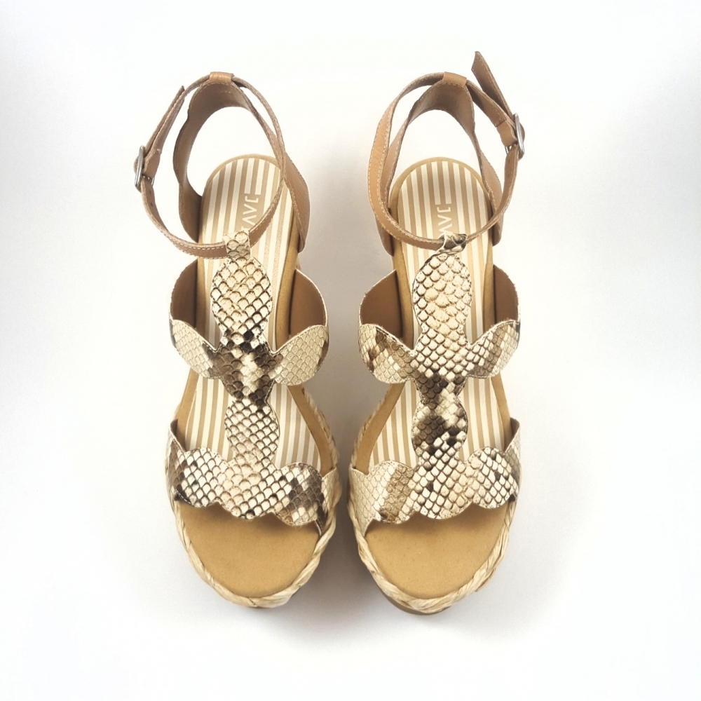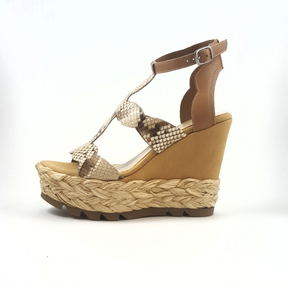Sandalia espectacular modelo 2501 Javiera combinada en vacuno grabado en serpiente y pulsera en marrón. Ajustable al tobillo mediante pulsera y hebilla lateral. Tiene una plataforma de 4cm elaborada en esparto trenzado y una cuña forrada en ante de 8 cm. para un total de 12cm. Creada y diseñada con los mejores materiales en España